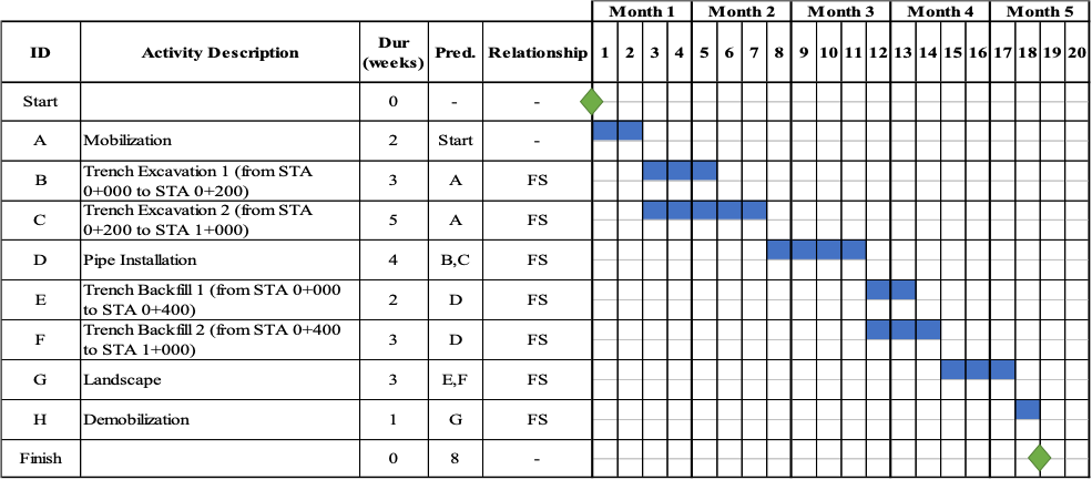 La programación lineal es un método que representa el tiempo y el espacio en el mismo gráfico, lo que crea la oportunidad de identificar y resolver conflictos de ubicación en el programa teniendo en cuenta diferentes tasas de producción de manera visual. Al poder visualizar todos los frentes de trabajo, sus rendimientos, y conocer los recursos asignados, se logra comprender de mejor manera la lógica del proyecto y facilitar el seguimiento o re-programación. A continuación un ejemplo hipotético de un proyecto lineal sencillo representado en diagrama de gantt y en LSM.